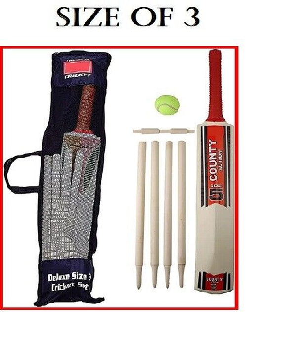 Complete Starter Set: Includes a wooden bat with rubber grip, 4 stumps, 2 bails, a soft red cricket ball, and a carry bag.